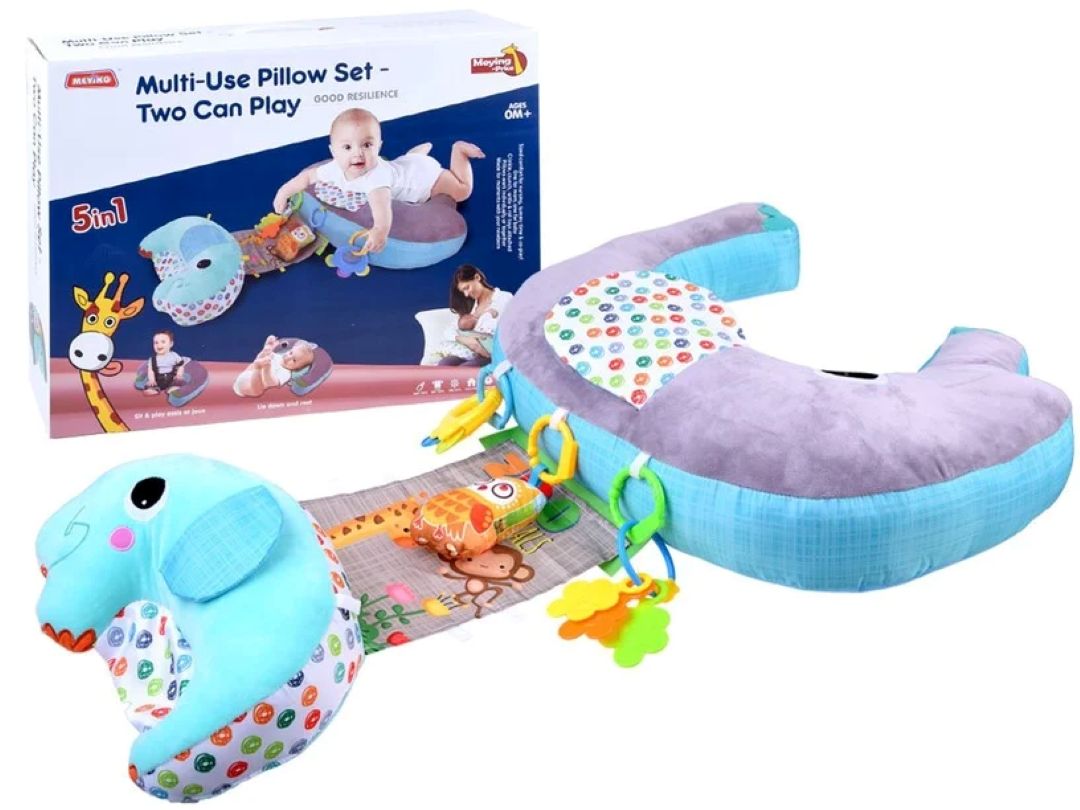 The product has a set of pillows, one for the mom and one for the child. The product is of the perfect size for nursing mothers. It includes rattle and roll toys. Pillows can work as a set or individually. The pillow can be used by the baby to lie down and rest and also to assist in sitting and playing.