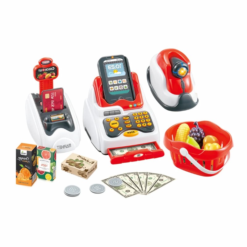 Included in Package : 1 cash register,1 scanner,1 printer,1 basket,3 food box,6 food toys,6 coins,6 banknote,1 bank card
