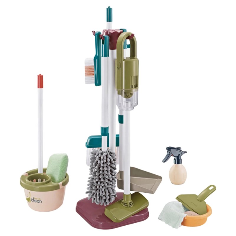 Included in Package : 1 sticker, 1 basin, 1 rag, 1 soap, 1 watering can, 1 broom, 1 dustpan, 1 feather duster, 1 mop, 1 bucket, 1 vacuum cleaner, 1 brush, 1 scraper, 1 sponge, 1 cleaning cloth, 1 bracket.